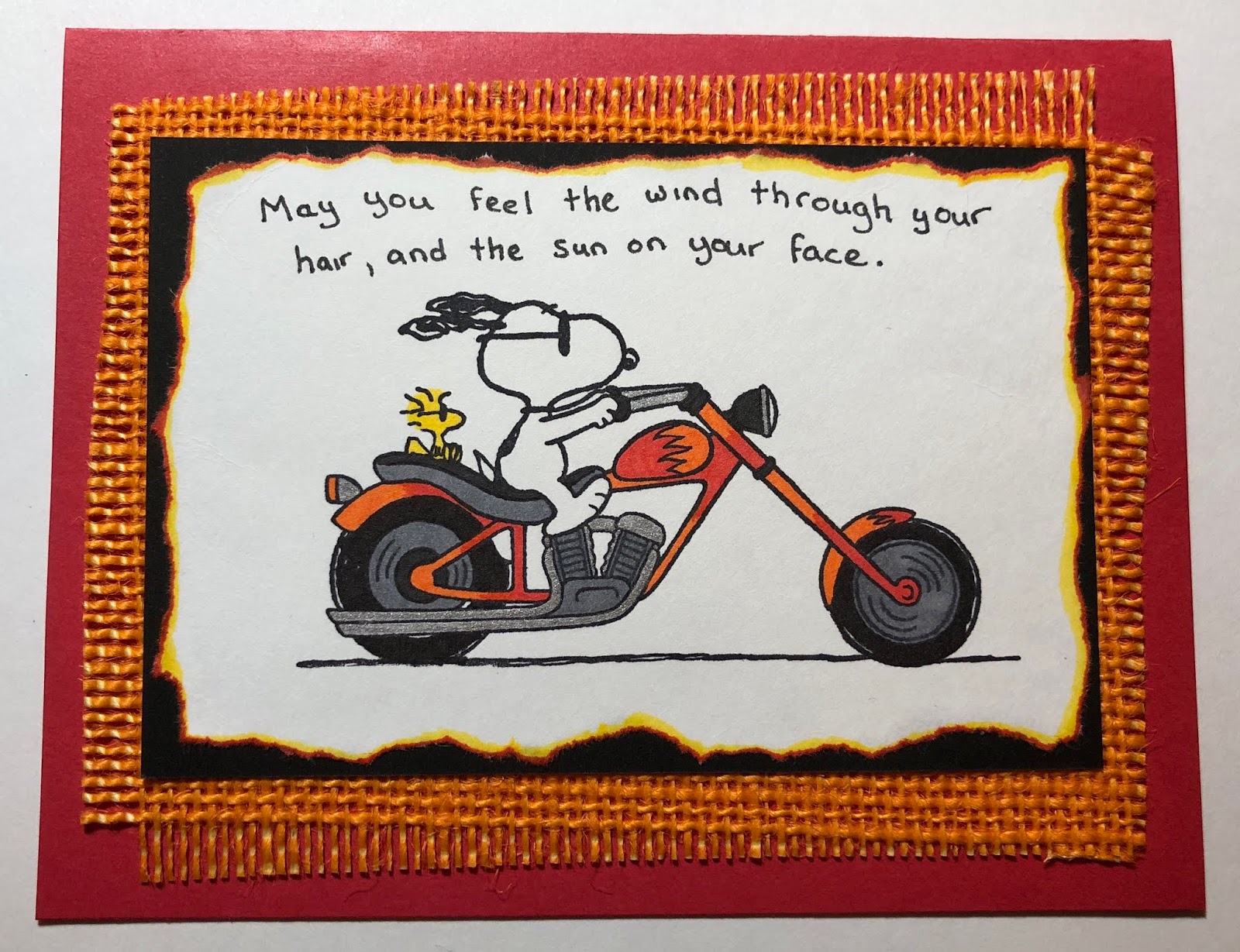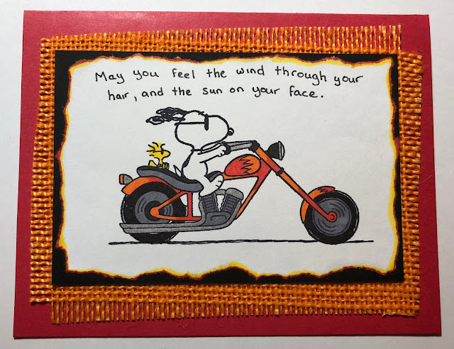 I made this card over the weekend for a friend of mine who is in the hospital. I stamped the snoopy and woodstock motorcycle image and then colored it in with sharpies. Tore it out and wrote the message on the top, and used my sharpies to give the edges the two toned color. Then I layered it up with some texture. It's simple, but I didn't have a lot of time and I really wanted to do something for my friend. Though it is simple I still like how it turned out.
