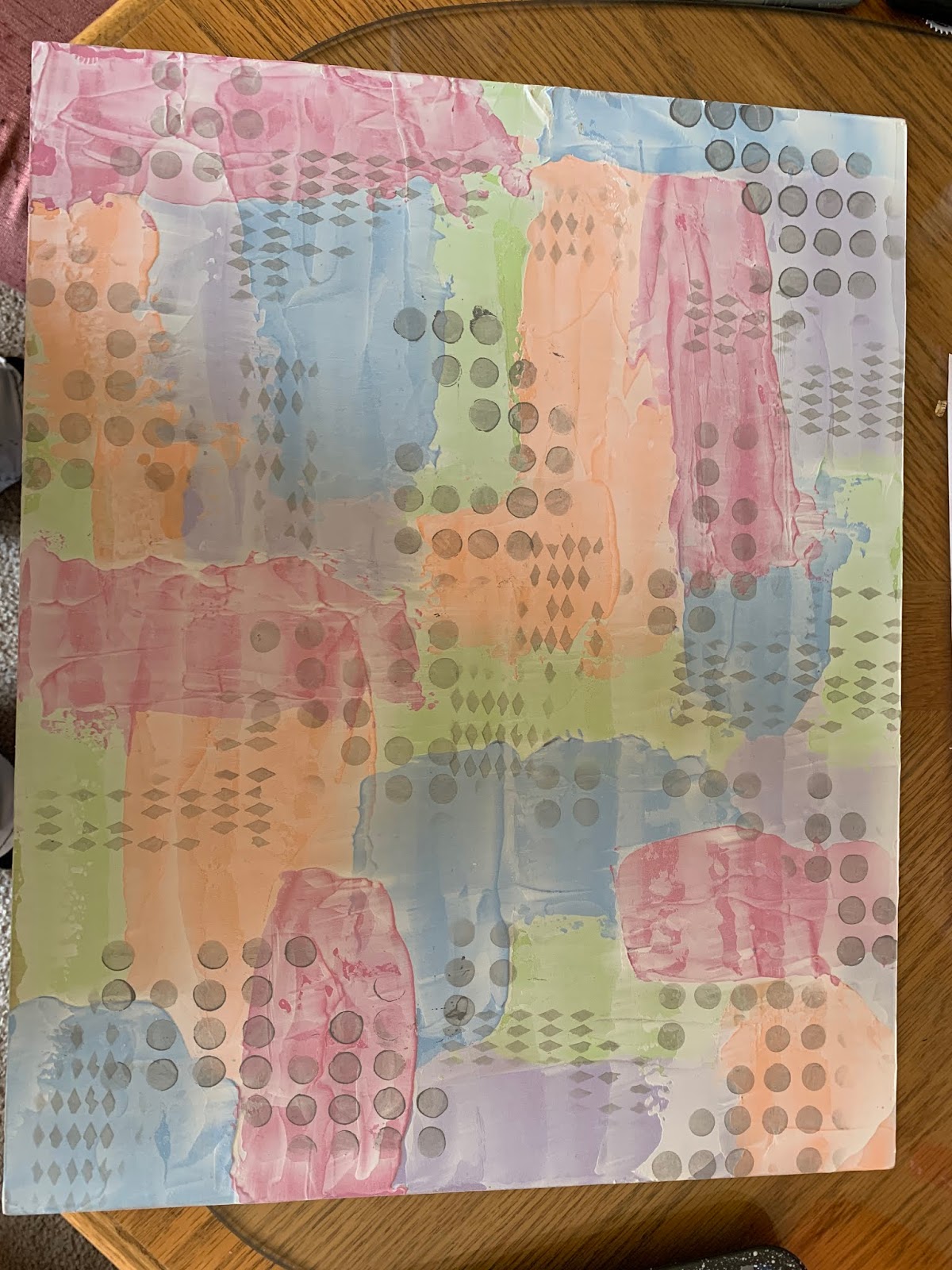 I started with a 16"x20" board and took bright colors and just added a whole bunch of white to make them more pastel. Using a pallet knife I just smeared the colors randomly over the board, and they still seemed a little bright to me, so I mixed white paint with matte medium to thin it down and again using the pallet knife smeared it over the whole surface. I loved the very rough look it provided.