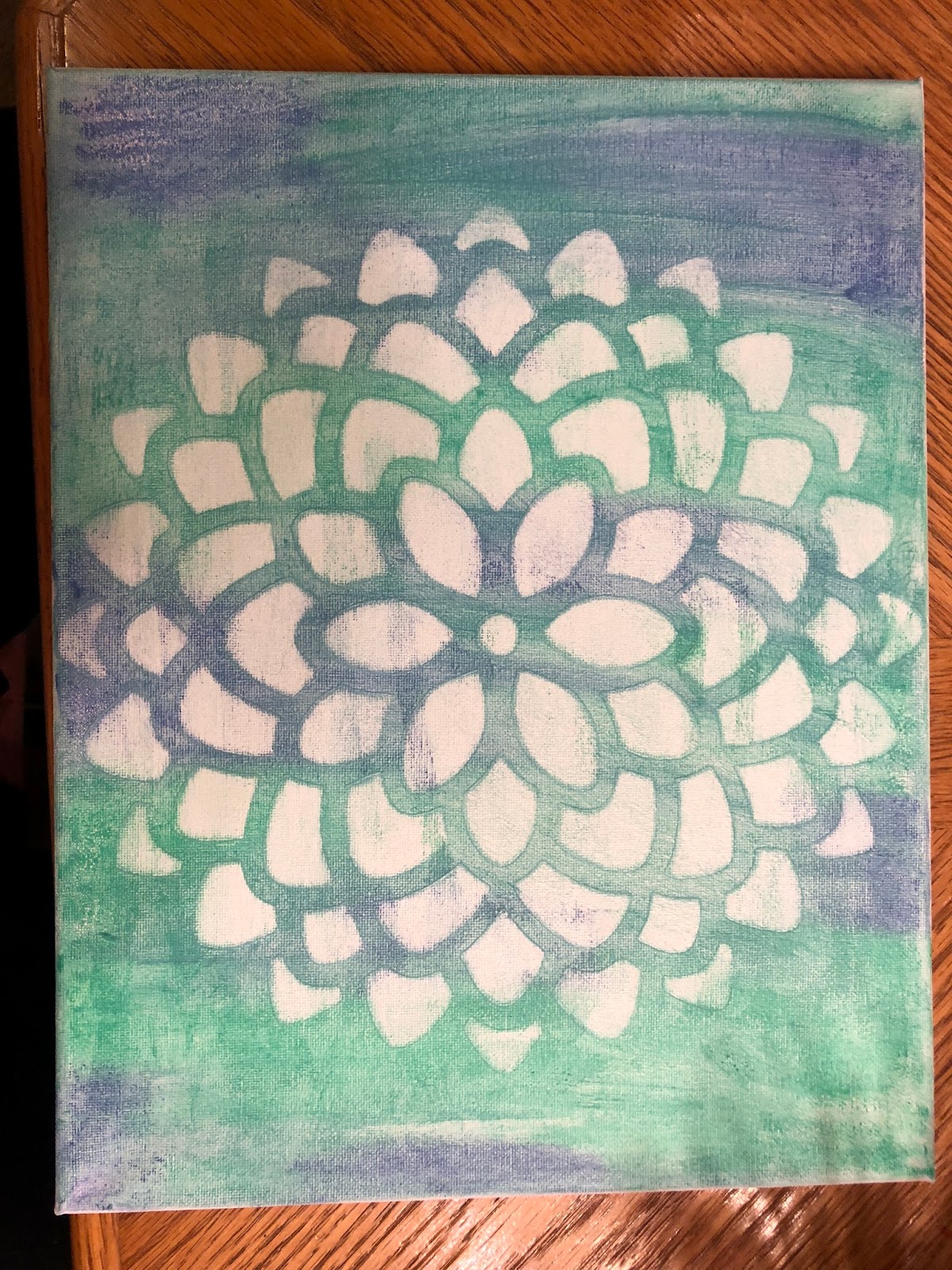 I started with a 16"x20" board and took bright colors and just added a whole bunch of white to make them more pastel. Using a pallet knife I just smeared the colors randomly over the board, and they still seemed a little bright to me, so I mixed white paint with matte medium to thin it down and again using the pallet knife smeared it over the whole surface. I loved the very rough look it provided.