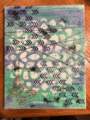 This spread I did this week will also be posted to the Simon Says Stamp Monday Challenge. I didn't originally make it with that intent but it worked out great. This spread was very simple and fun. I put distress oxides down all over both pages. Then I spritzed and sprayed and dried and added until I liked the outcome. Including just stamping the square ink pad right onto the pages at times. Then I used a large Dylusions stencil that has a great flowery print around the outside with fun random dots on the inside. I used extra heavy gel medium and went over the whole stencil in one direction on the left page, the I flipped it end for end and did it again to the right page. A day later when it was finally dry I spent several minutes just in awe of how it came out and the texture it provided. Then I sprayed the whole thing with silvery glimmer mists, it very hard to see if the picture, but in person it has a great sheen to it. Then I put normal white embossing paste through several word stencils, then I covered it in embossing powder, and I melted the embossing powder before letting the paste dry. Which gives it a fun squishy foamy feeling. I tore them all out, went around the edges with my orange wink a stella pen, stuck them down with foam mounting tape, and voila! It was so easy and so much fun, and is just bursting with texture, I love it!!