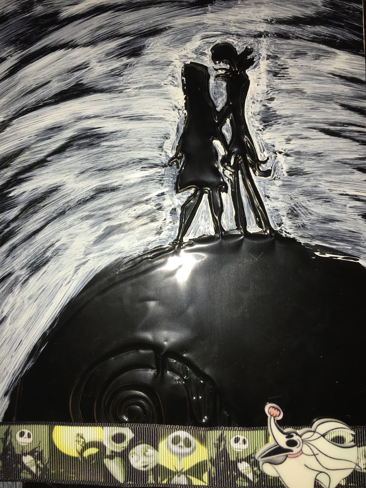 This weeks Simon Says Stamp Monday Challenge, is A Walk On The Dark Side. I was absolutely ecstatic and knew exactly what I wanted top do! So out came every piece of Nightmare Before Christmas stuff I could find. However, the first thing I did was pull out my thin metal sheets and my tools and spent the day trying to create the iconic Jack and Sally silhouette on the hill side. Overall it didn't come out as well as I had hoped, and I had to use some paint to offset the characters because the lines didn't seem defined enough to me. But it was way better than I figured I could do when I started, so I was pretty happy. I got that stuck down, and with a fair amount of irritation and effort I finally got the inside edge to stop getting bent every time I opened and closed my art journal lol. Then I used black gesso on the page next to it, layered up a laser cut Nightmare Before Christmas sign on some white card stock and stuck that down. Then I ran the strip of ribbon across the bottom. Then I took two plastic cutouts, one of Zero and one of Jack and put them down. Then I pulled out my 20th anniversary edition of the Nightmare Before Christmas book, and found the portion I wanted to use and wrote that out in white gel pen, and it was going to well until I messed up on that one word, so just kind of try and ignore the crossed out blob of white near the bottom lol. Even though it did not come out perfectly I am very happy with how it did turn out, and I know it will always be a layout that is near and dear to me. Enjoy!